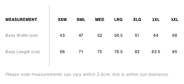Size Guide How's Ya Mate TEEs Size Guide How's Ya Mate HOODIE Size Guide How's Ya Mate MENS TRACKIE Size Guide How's Ya Mate WOMENS TRACKIE Size Guide Returns >